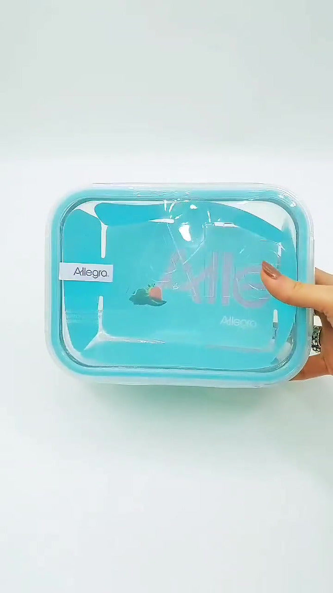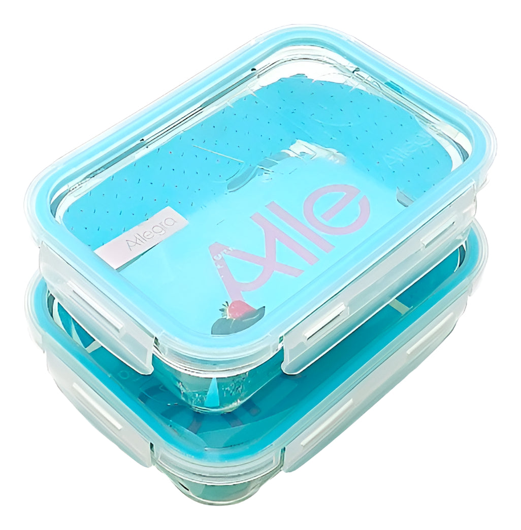 Pack de dos contenedores herméticos de vidrio marca Allegra, ideales para transportar comidas cuidando la vida útil y frescura de los alimentos, sin rastro de olores o manchas a lo largo de su uso independientemente del tiempo, son resistente a golpes y libres de BPA.