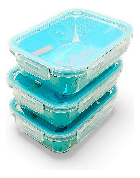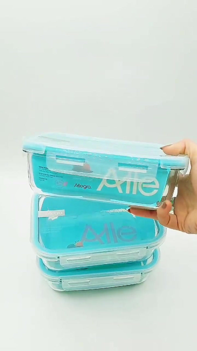 Pack de tres contenedores herméticos de vidrio marca Allegra, ideales para transportar comidas cuidando la vida útil y frescura de los alimentos, sin rastro de olores o manchas a lo largo de su uso independientemente del tiempo, son resistente a golpes y libres de BPA.