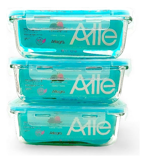 Pack de tres contenedores herméticos de vidrio marca Allegra, ideales para transportar comidas cuidando la vida útil y frescura de los alimentos, sin rastro de olores o manchas a lo largo de su uso independientemente del tiempo, son resistente a golpes y libres de BPA.